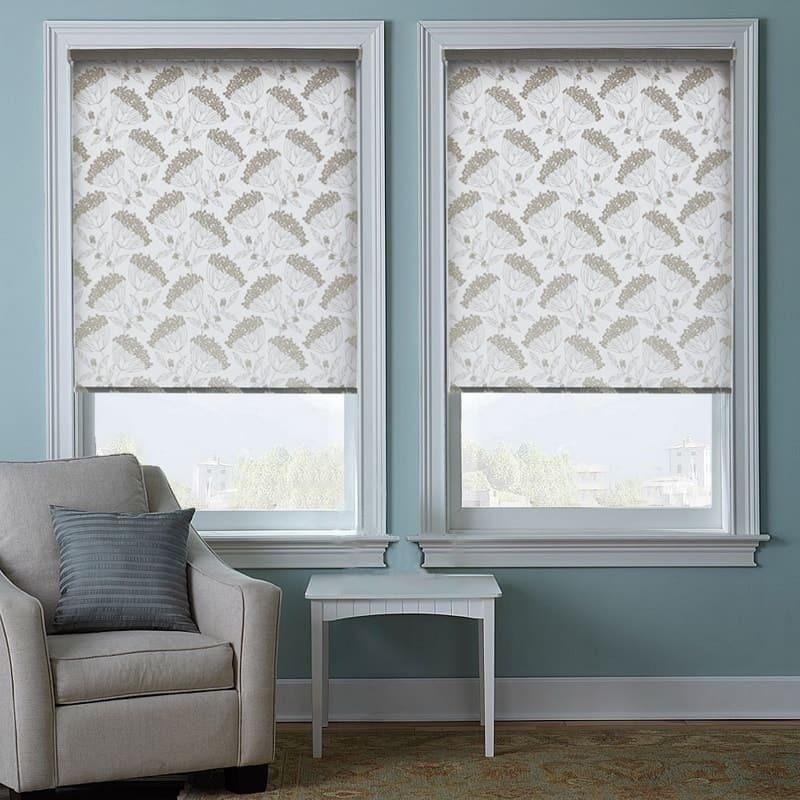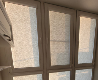 Рассеивающие кассетные шторы установлены отдельно на каждую створку витражного окна. Ткань с рисунком.