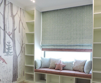 Римская штора из плотной ткани в детскую комнату. В аккомпанементе с сидушками на подоконник и набором декоративных подушек.