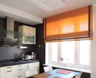 Яркая римская штора на кухне с установкой на весь проем и контрастной окантовкой по краям.