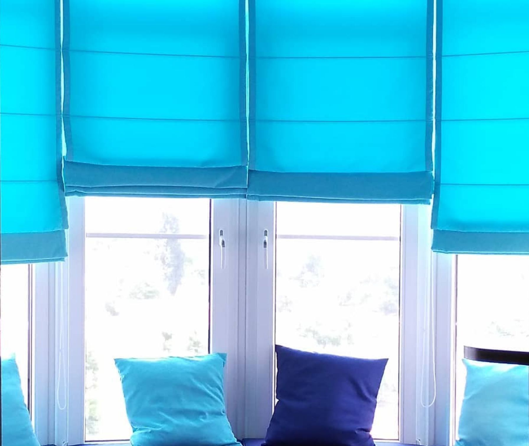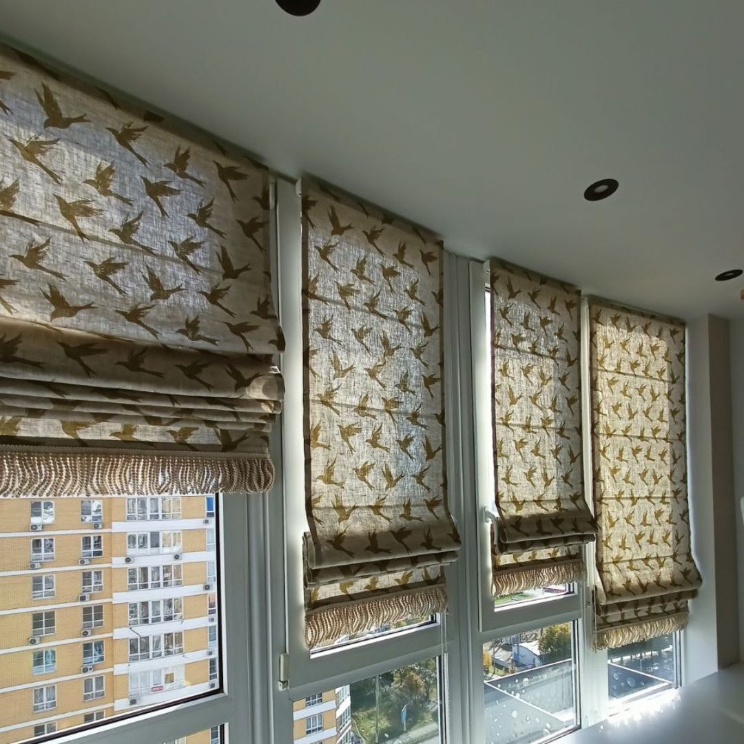 Римские шторы из плотной ткани на эркерное окно. Контрастно декорированы полосками ткани с узелками внизу.