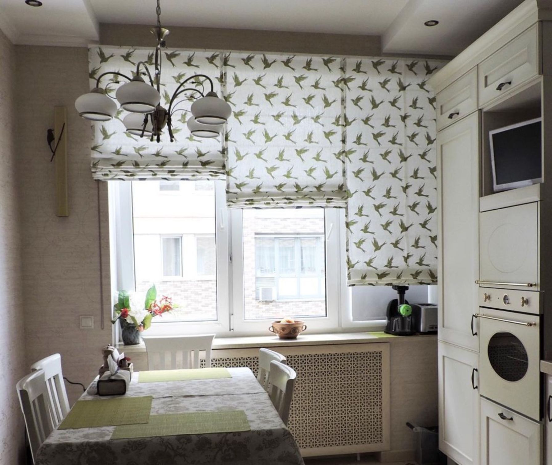 Римские шторы на окно с балконной дверью. Рисунок на ткани повторяет узор фартука.