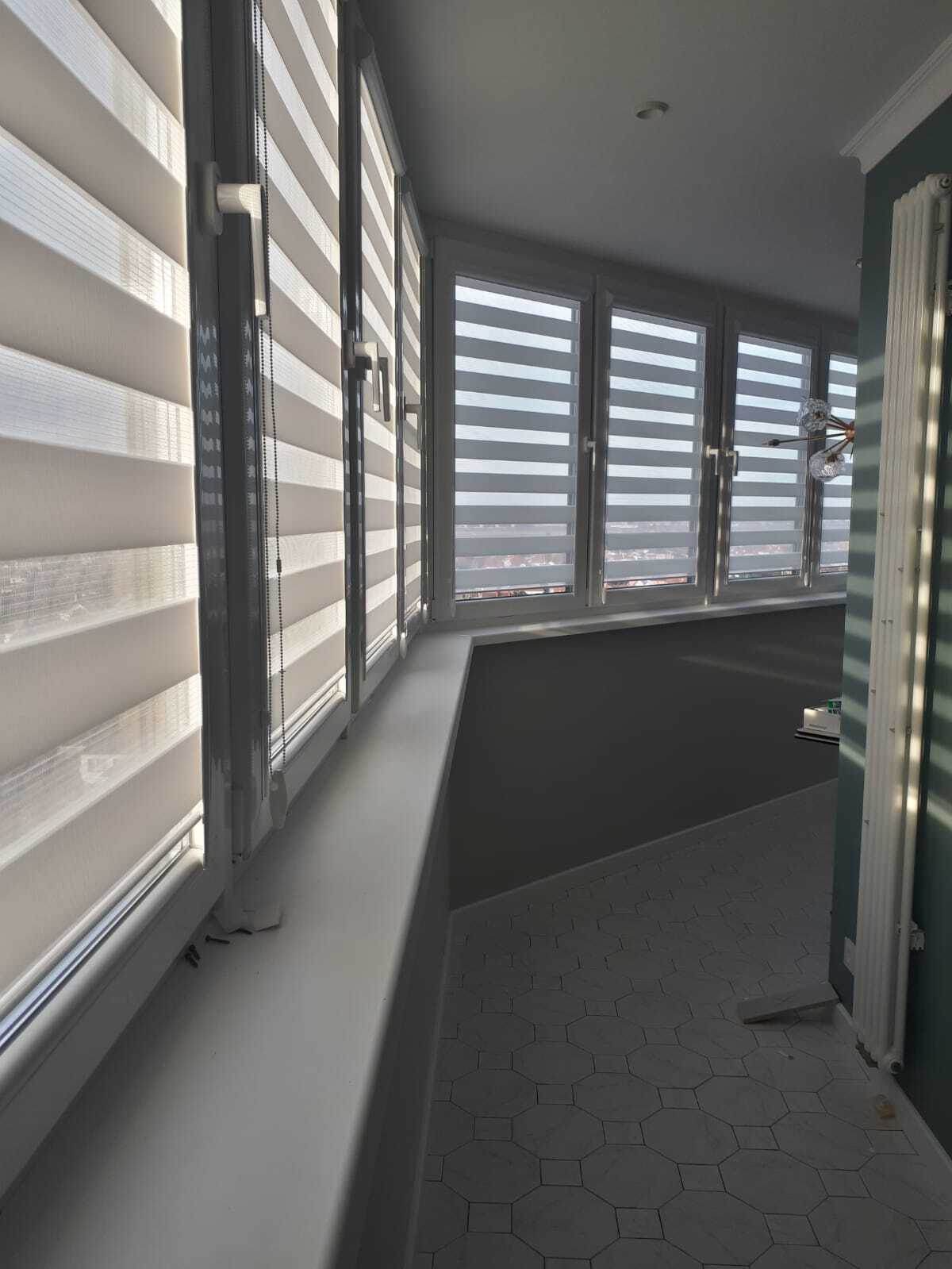 Кассетные шторы Зебра на балконе установлены на каждую створку. Придают балкону индивидуальный стиль.