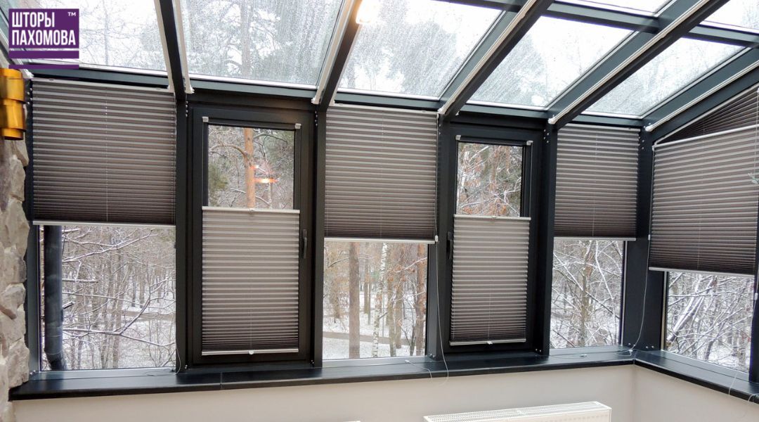 Рулонные шторы установлены на витраже мансардного этажа в коттедже. Окно сложной формы, со скошеным верхом.