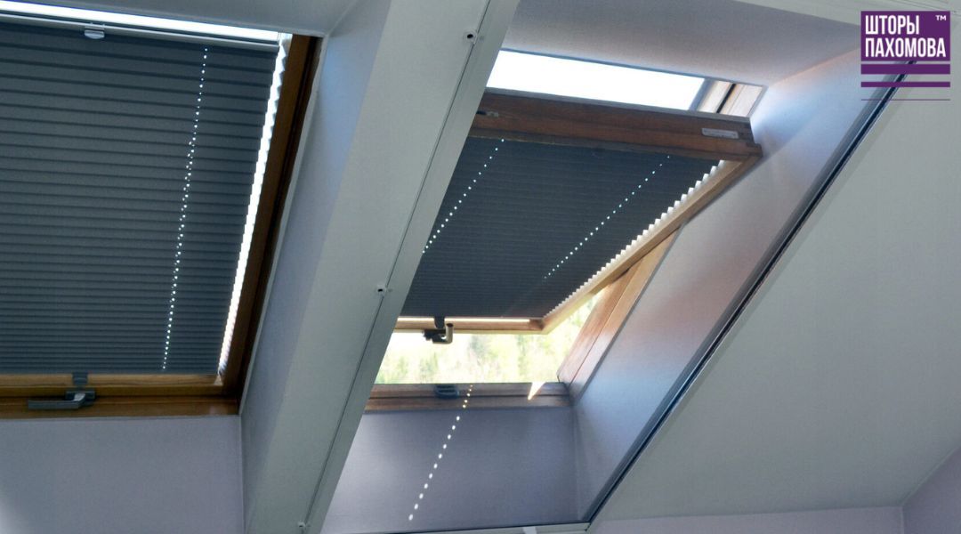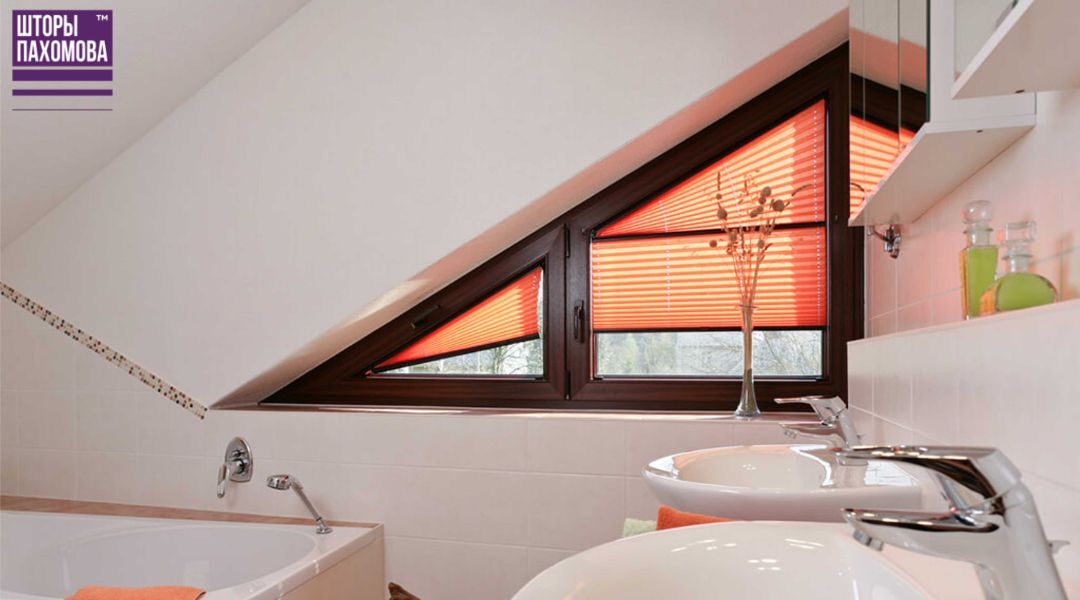 Рулонные шторы установлены на мансардном этаже в коттедже. Окно со скошеным верхом.