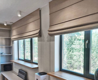 Римские шторы в офисе. Отличительной чертой этой модели штор является вывернутые наружу швы на складках.