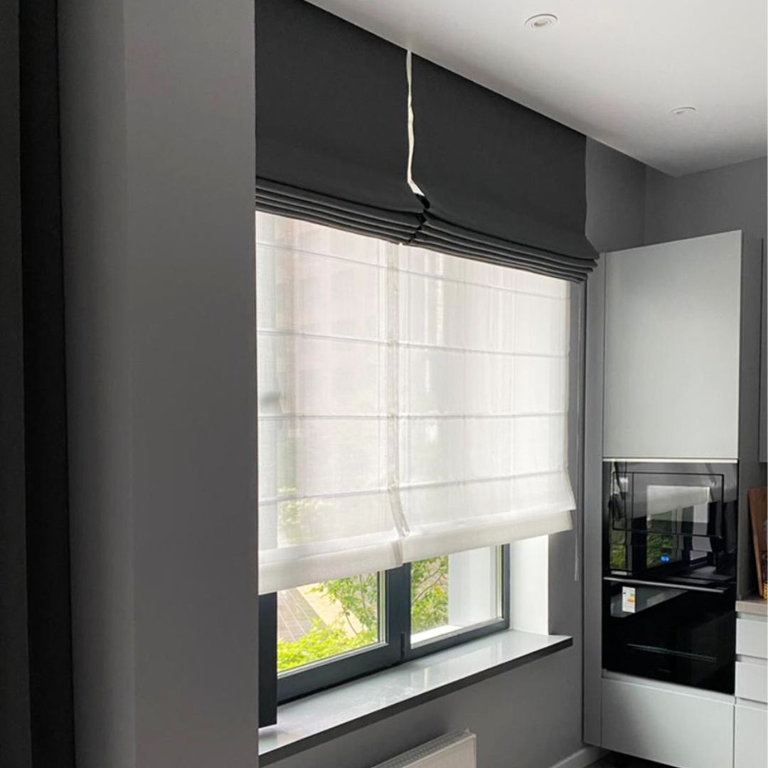 Римские шторы с установкой отдельно на каждую створку из полупрозрачного тюля.