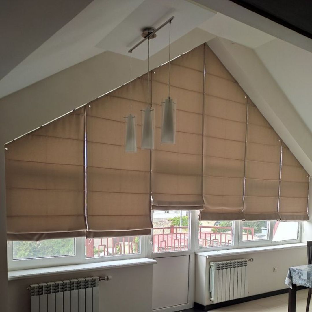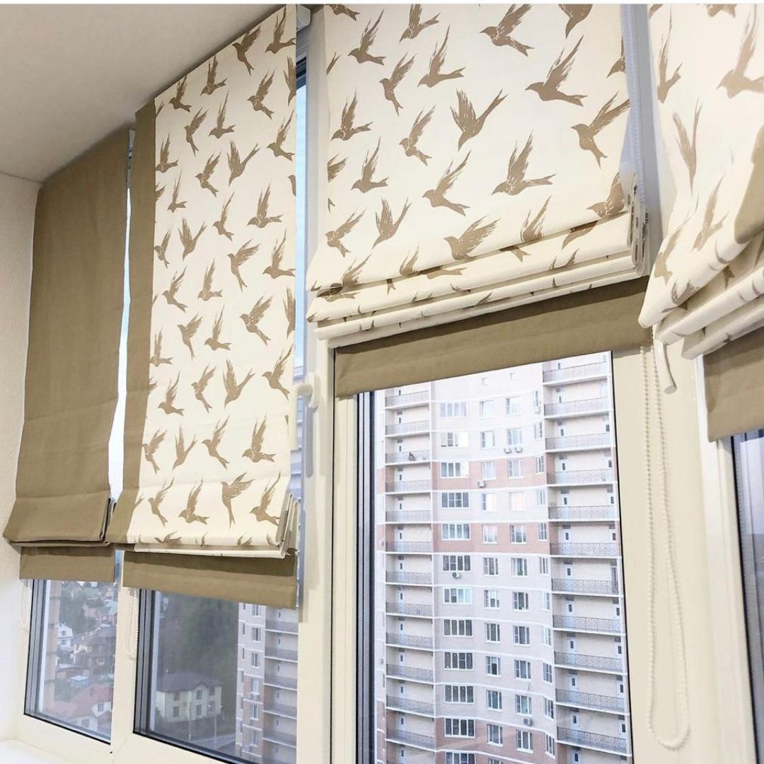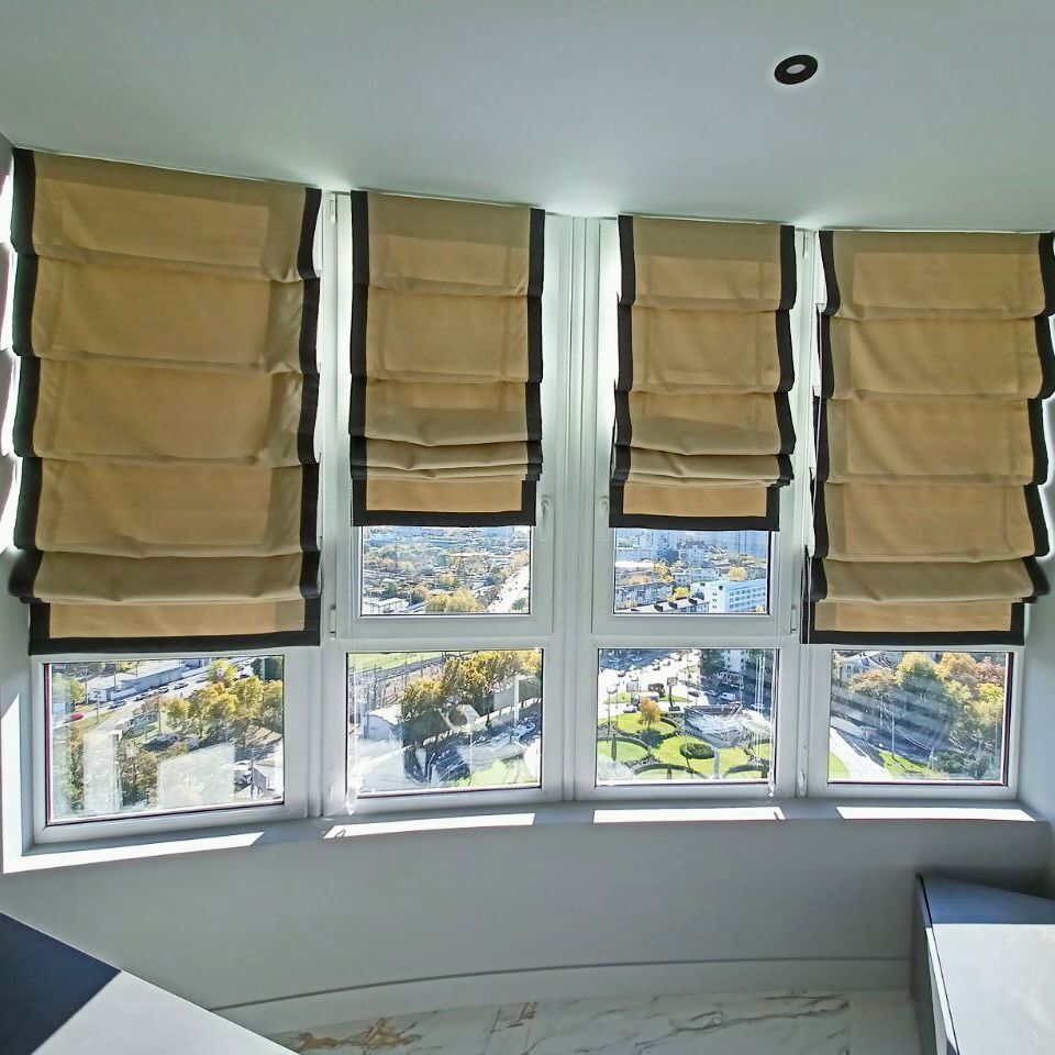 Римские шторы из плотной ткани на эркерное окно. Контрастно декорированы полосками ткани с узелками внизу.
