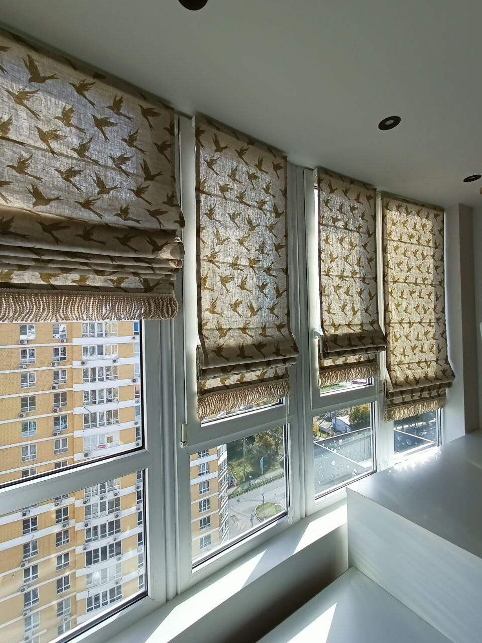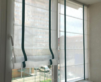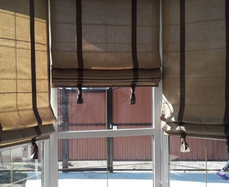 Римские шторы из плотной ткани на эркерное окно. Контрастно декорированы полосками ткани с узелками внизу.