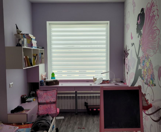 Рулонные шторы Зебра (день-ночь) установлены на проем окна в детской комнате. Комфортный свет для школьника днем и защита от света луны, фонаря ночью.