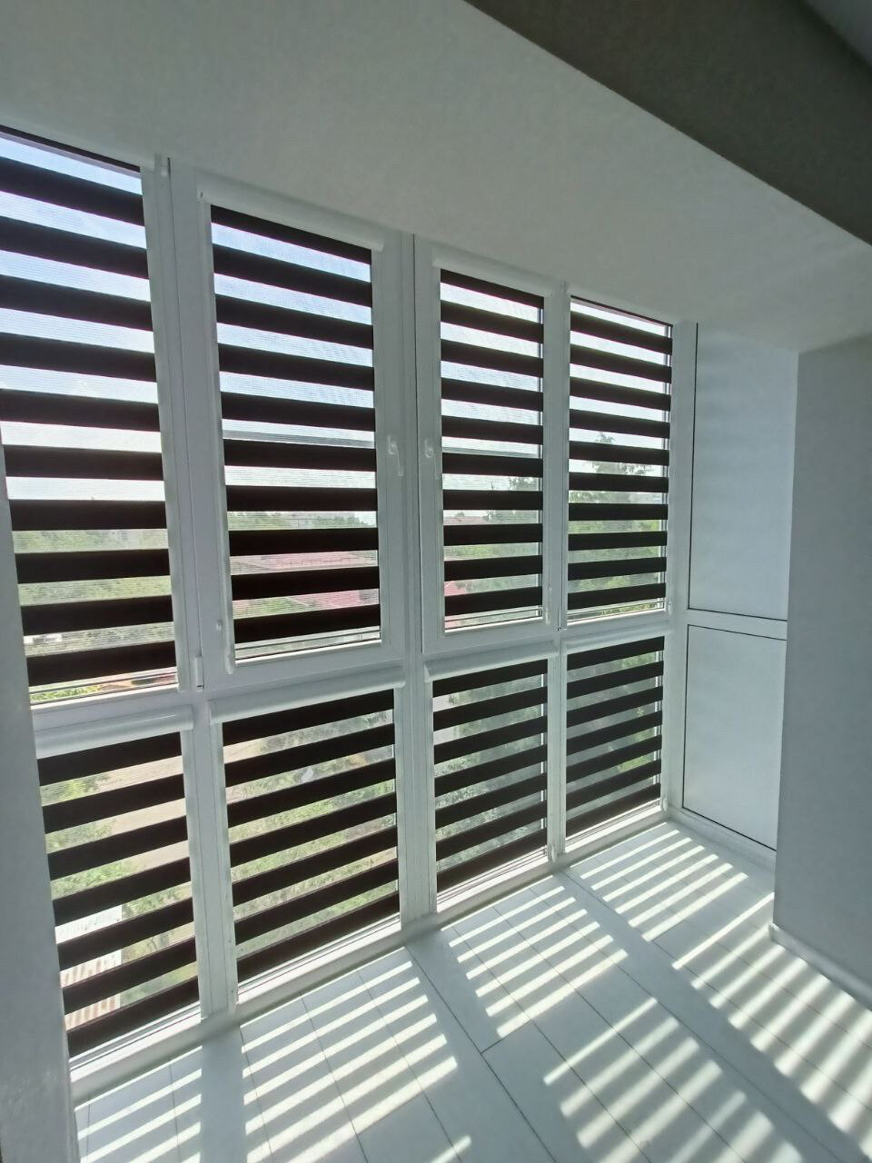 Кассетные шторы Зебра на балконе установлены на каждую створку. Придают балкону индивидуальный стиль.
