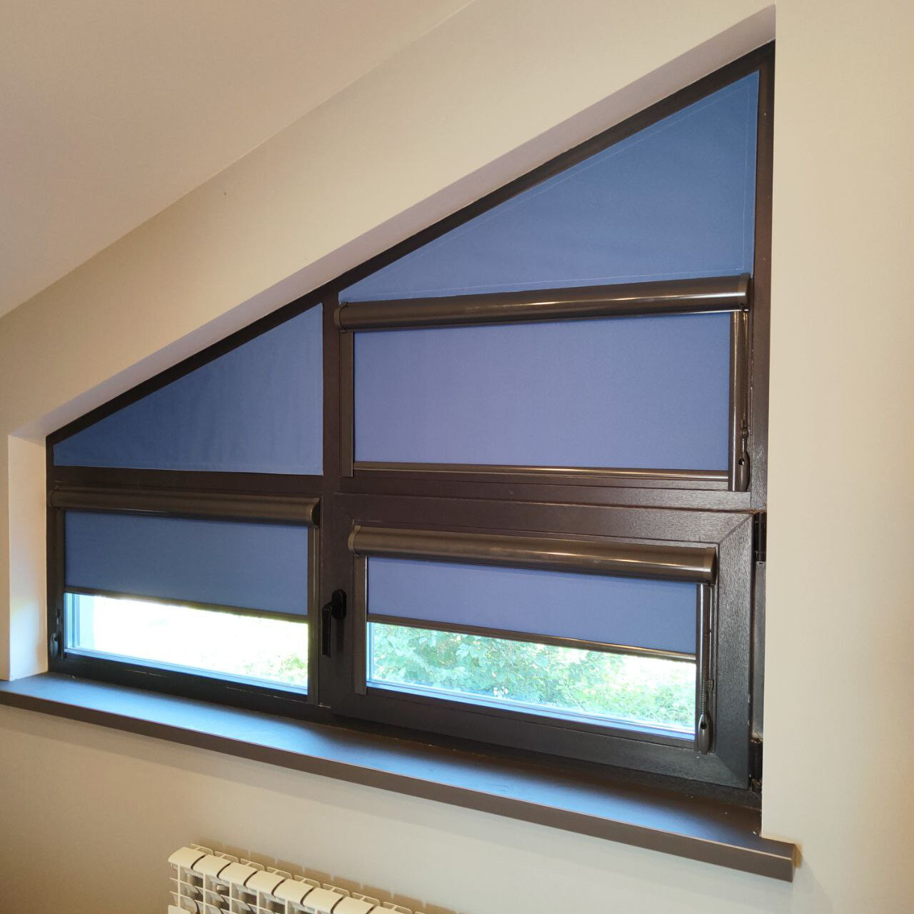 Рулонные шторы установлены на витраже мансардного этажа в коттедже. Окно сложной формы, со скошеным верхом.