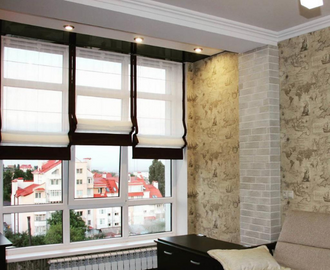 Римские шторы на каждую створку окна на лоджии совмещенной с комнатой.