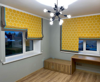 Римские шторы на два окна в частном доме из яркой желтой ткани с геометрическим рисунком и обрамлением серой полосой.