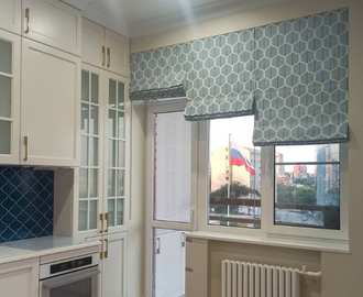 Римские шторы на окно с балконной дверью. Рисунок на ткани повторяет узор фартука.
